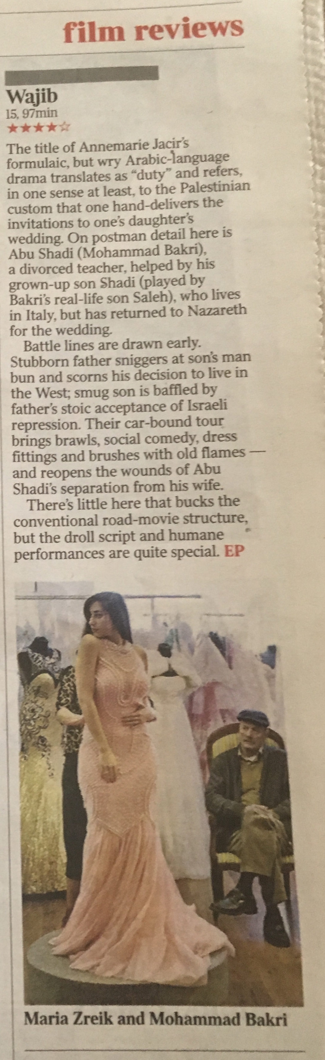 "This is expert filmmaking from Annemarie Jacir, now a veteran of the art house festival circuit. A story of fathers and sons, East and West, progression and conservation, Wajib intelligently explores the tensions within an Arab family living in contemporary Israel."